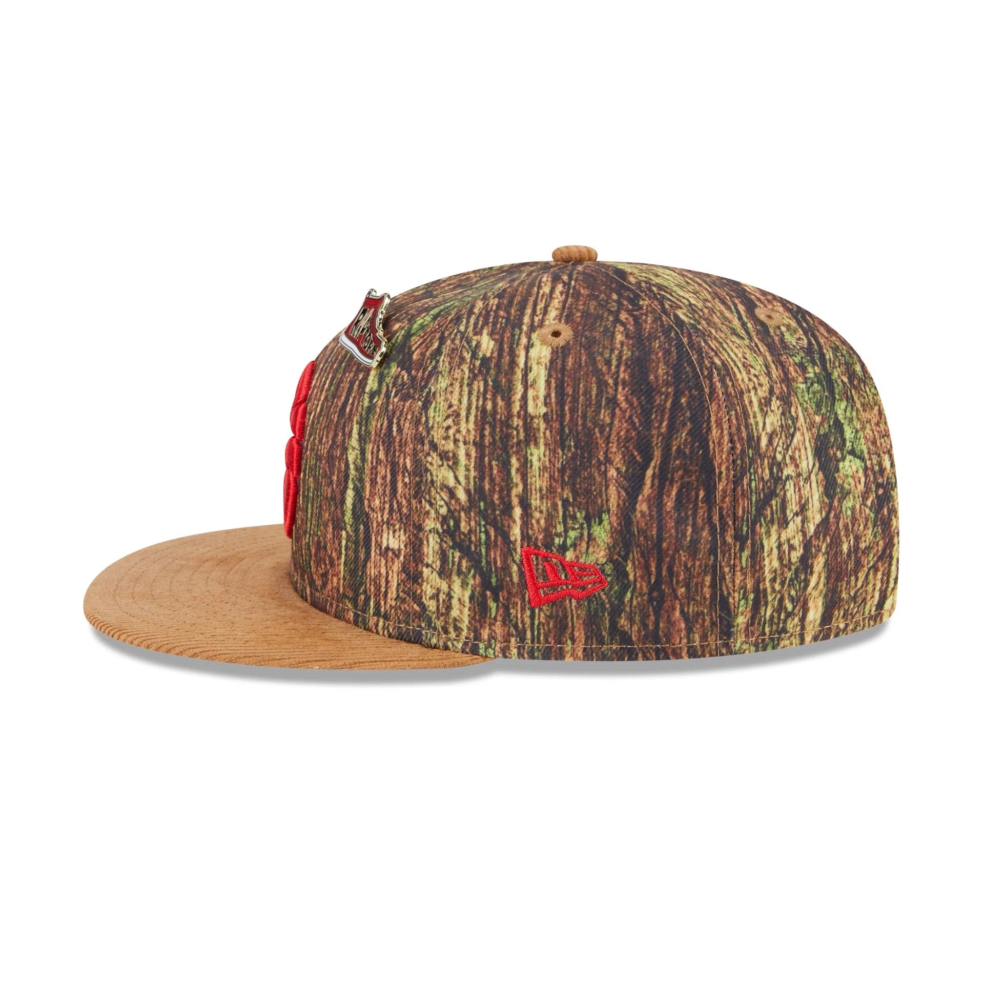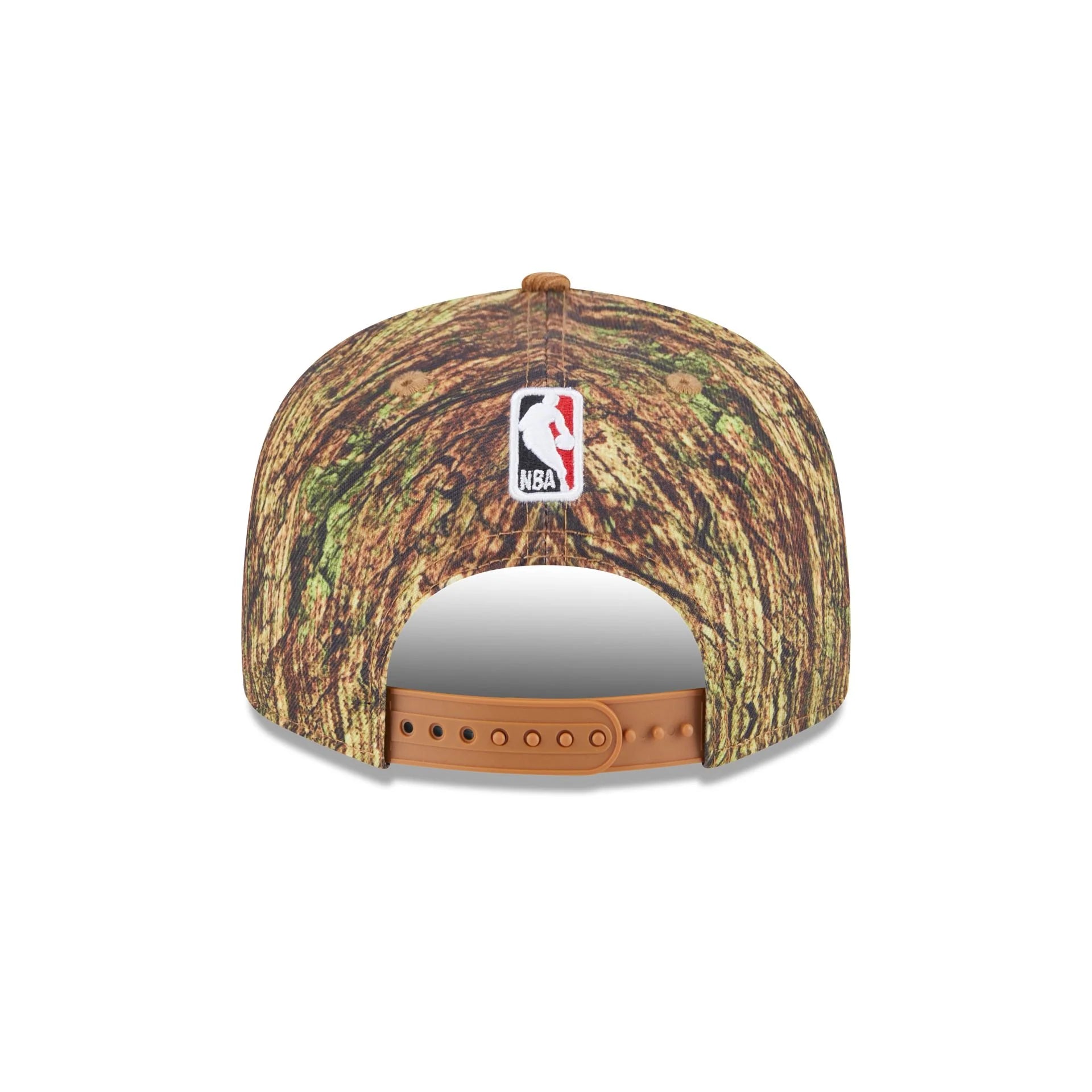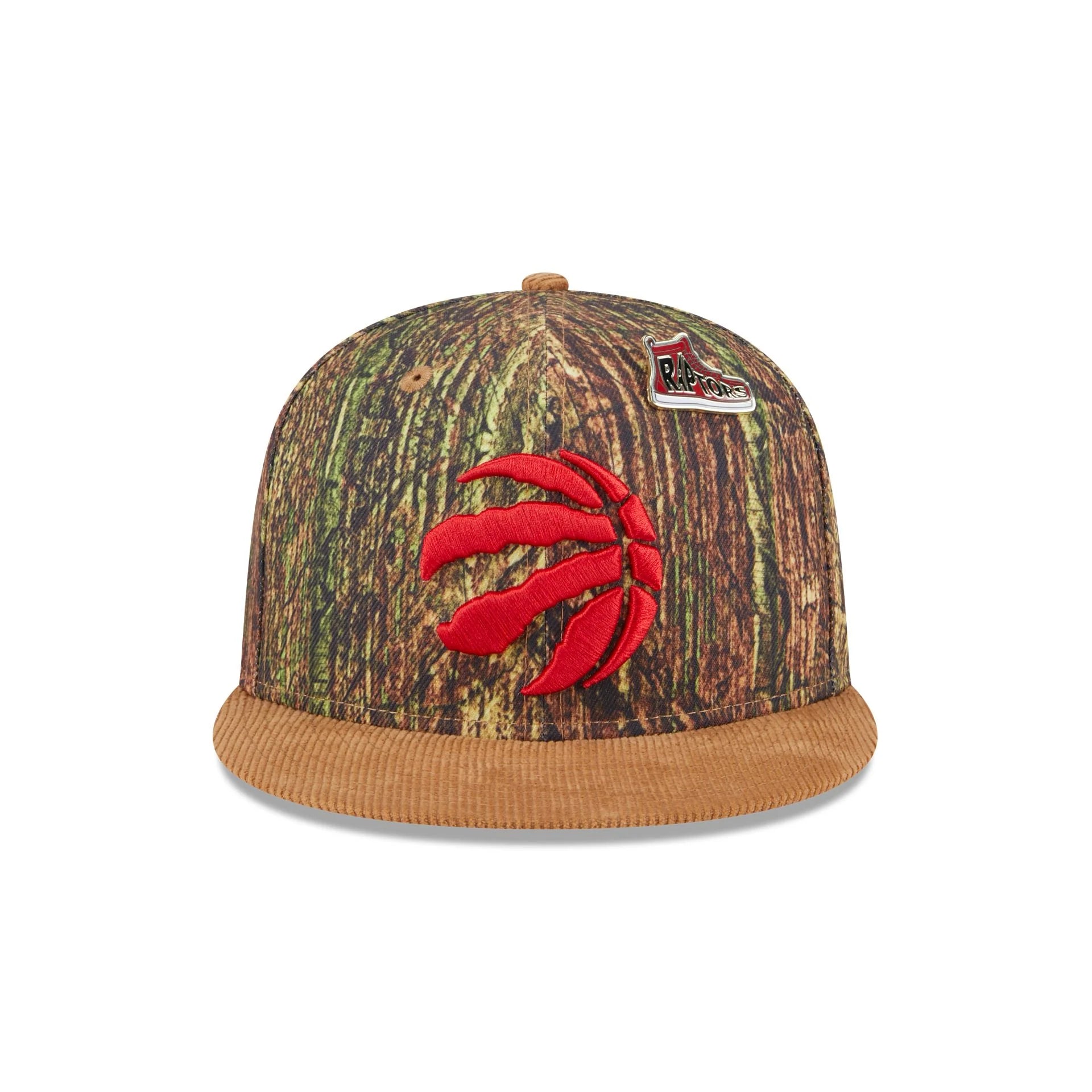 The Toronto Raptors 2025 All-Star Game Fan Pack Grove 9FIFTY Snapback features an embroidered Raptors logo at the front camo panels with a matching sneaker pin and a mesh back. Additional details include an NBA Logoman above a snapback closure at the rear and a gray undervisor.