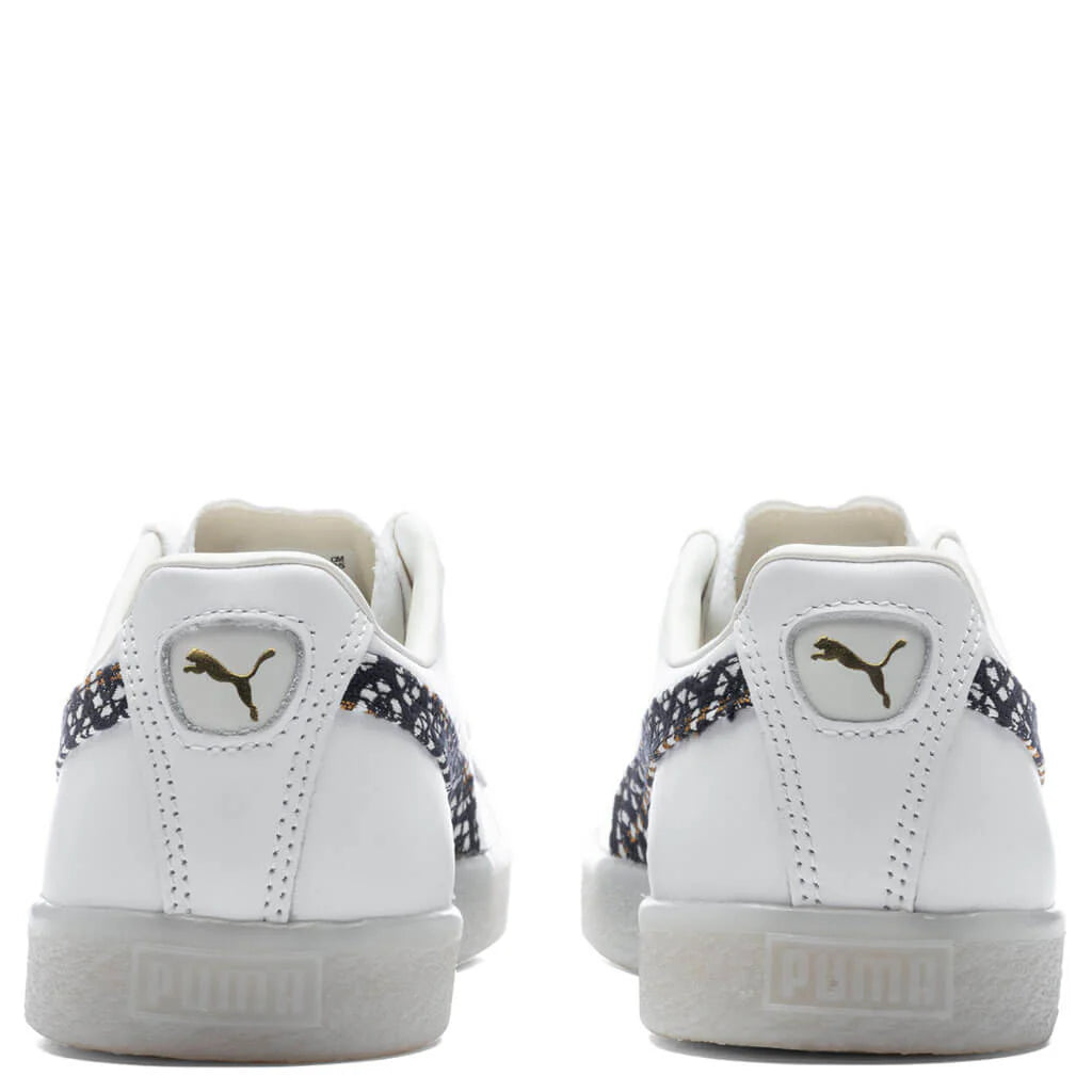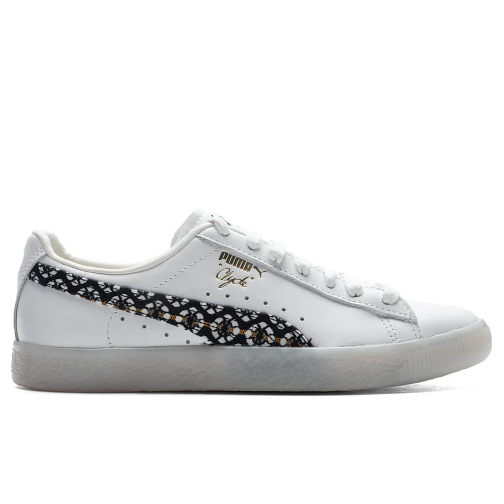 Puma’s signature Clyde receives a new iteration in this new version. Taking on a leather upper, the Formstrip is treated with a distinct textile pattern. A synthetic tongue makes an impression, while the debossed and gold-foiled Puma branding at the quarter makes an impression. The rubber outsole wraps up the design.